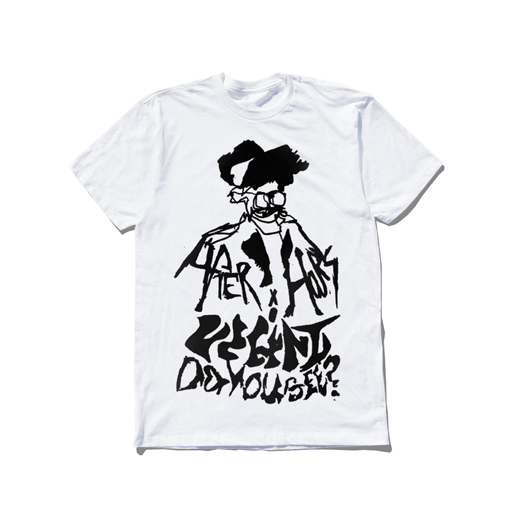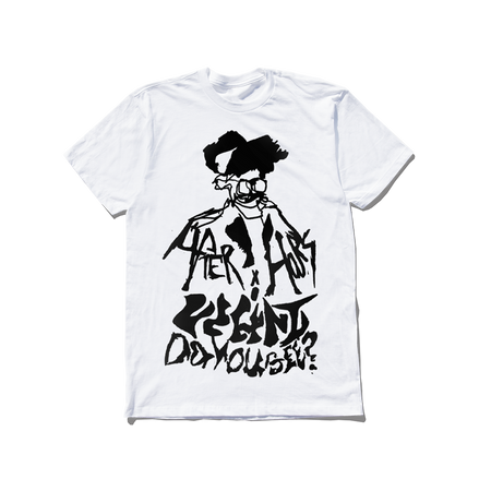 WHITE COTTON T-SHIRT FEATURING AFTER HOURS SCREEN PRINTED GRAPHIC ON FRONT. MACHINE WASH COLD, DELICATE CYCLE, TUMBLE DRY LOW. DO NOT IRON EMBELLISHMENT. 100% COTTON.